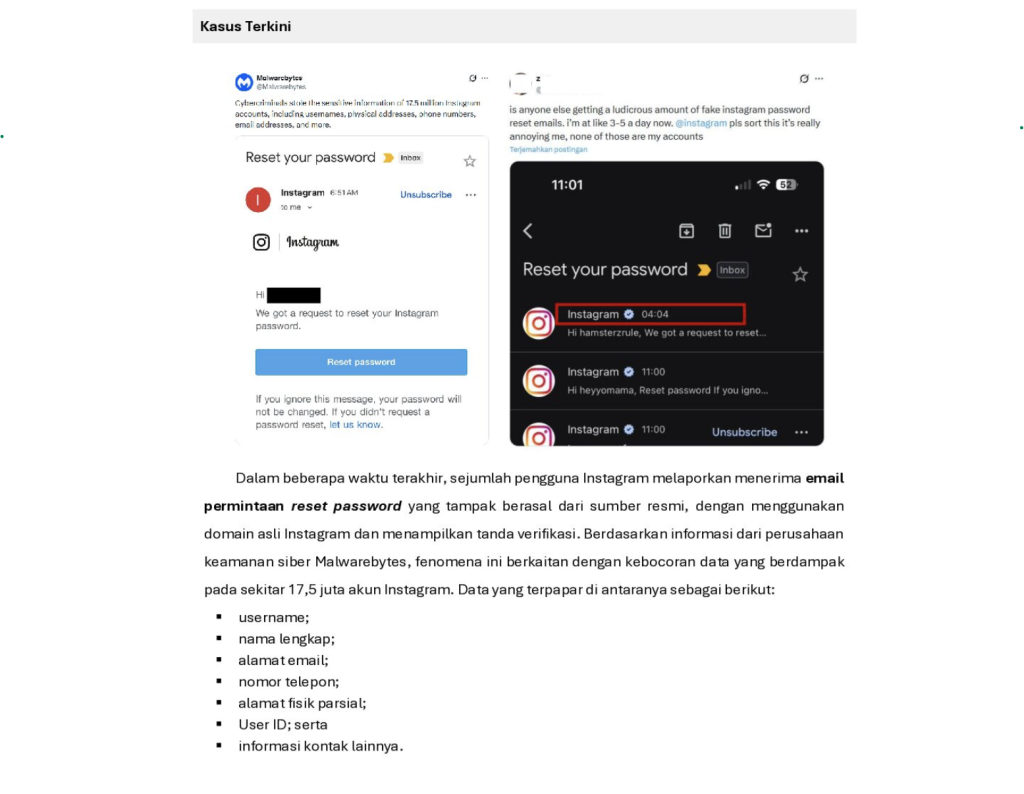 Dalam beberapa waktu terakhir, sejumlah pengguna Instagram melaporkan menerima email permintaan reset password yang tampak berasal dari sumber resmi, dengan menggunakan domain asli Instagram dan menampilkan tanda verifikasi. Serangan yang terjadi tidak dilakukan melalui peretasan langsung terhadap sistem Instagram, melainkan dengan memanfaatkan data hasil kebocoran dan fitur resmi pemulihan akun.